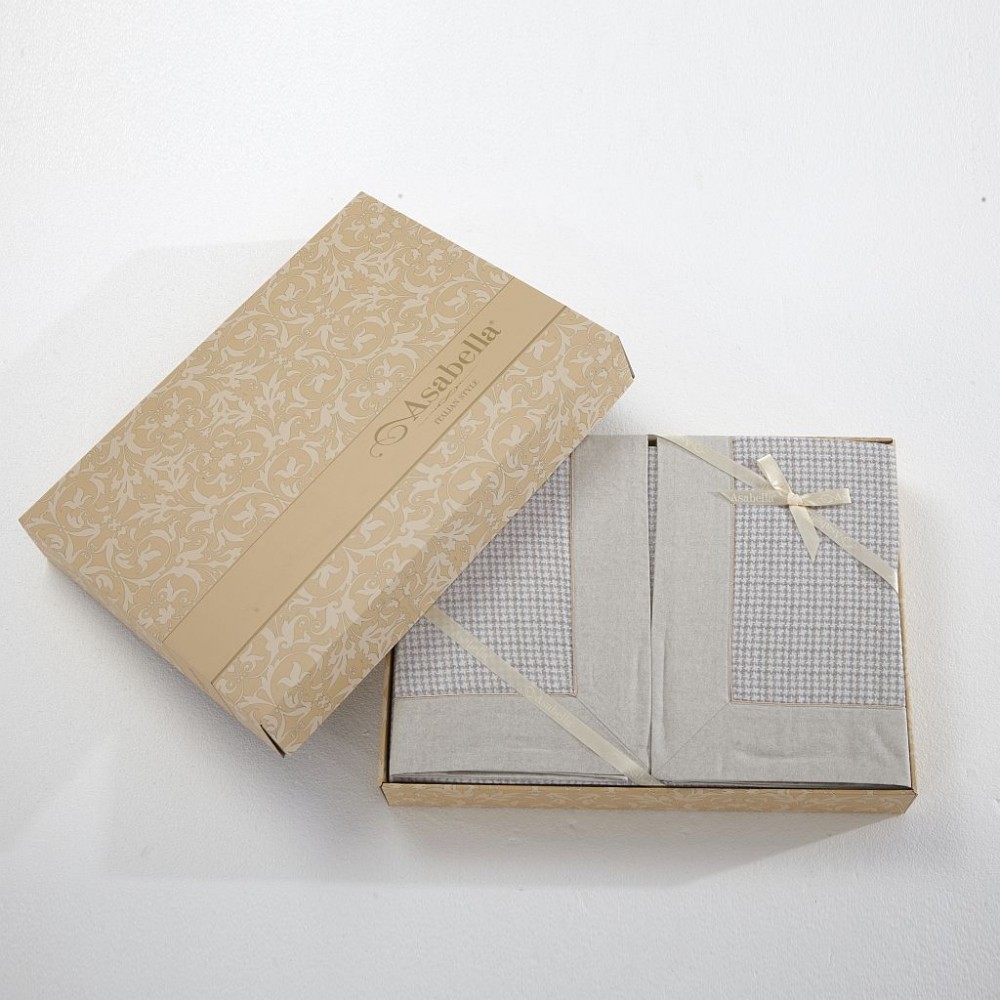 Пододеяльники декорированы "ушками" с трех сторон. Закрываются на скрытую молнию, расположенную внизу пододеяльника. Внутри пододеяльников предусмотрены специальные тесемочки для фиксации одеяла (на одеяле должны быть ответные петли). Эта небольшая деталь сделает использование постельного белья еще комфортнее: одеяло не сбивается в пододеяльнике, и заправлять его становится гораздо удобнее. Наволочки в размере 50х70 см выполнены в оксфордском дизайне - с "ушками" с трех сторон. "Ушки" наволочек и пододеяльников выполнены из ткани-компаньона и декорированы тонким золотистым кантом. Наволочки в размере 70х70 см выполнены в классическом дизайне. Все наволочки закрываются методом запаха. Простыня в комплекте свободная (прямая). Комплекты упакованы в подарочную коробку.