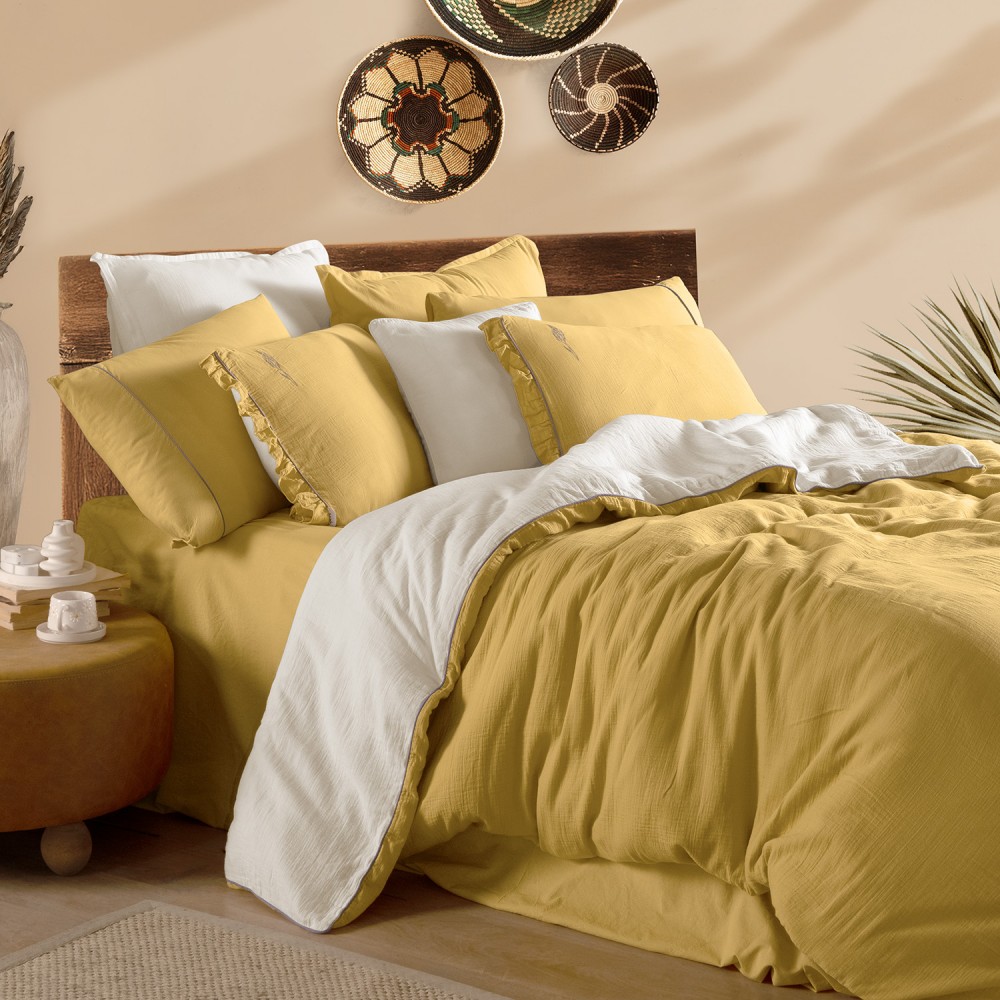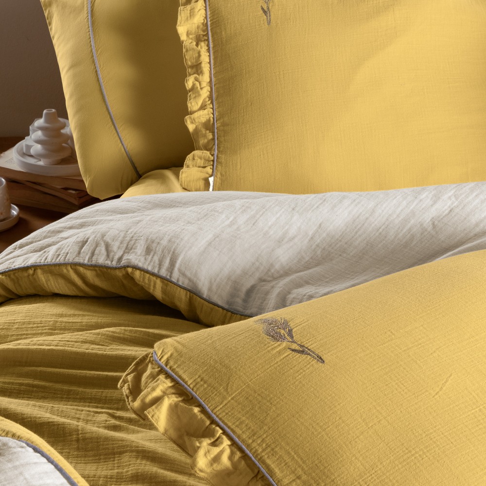 Комплекты постельного белья «Kenyon Sari» выполнены из воздушного хлопкового муслина и украшены милой вышивкой с колосками и оборками. В дизайне использованы ткани двух расцветок.