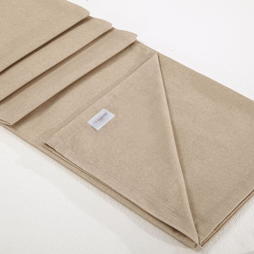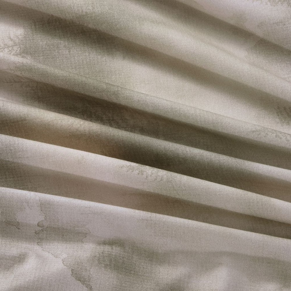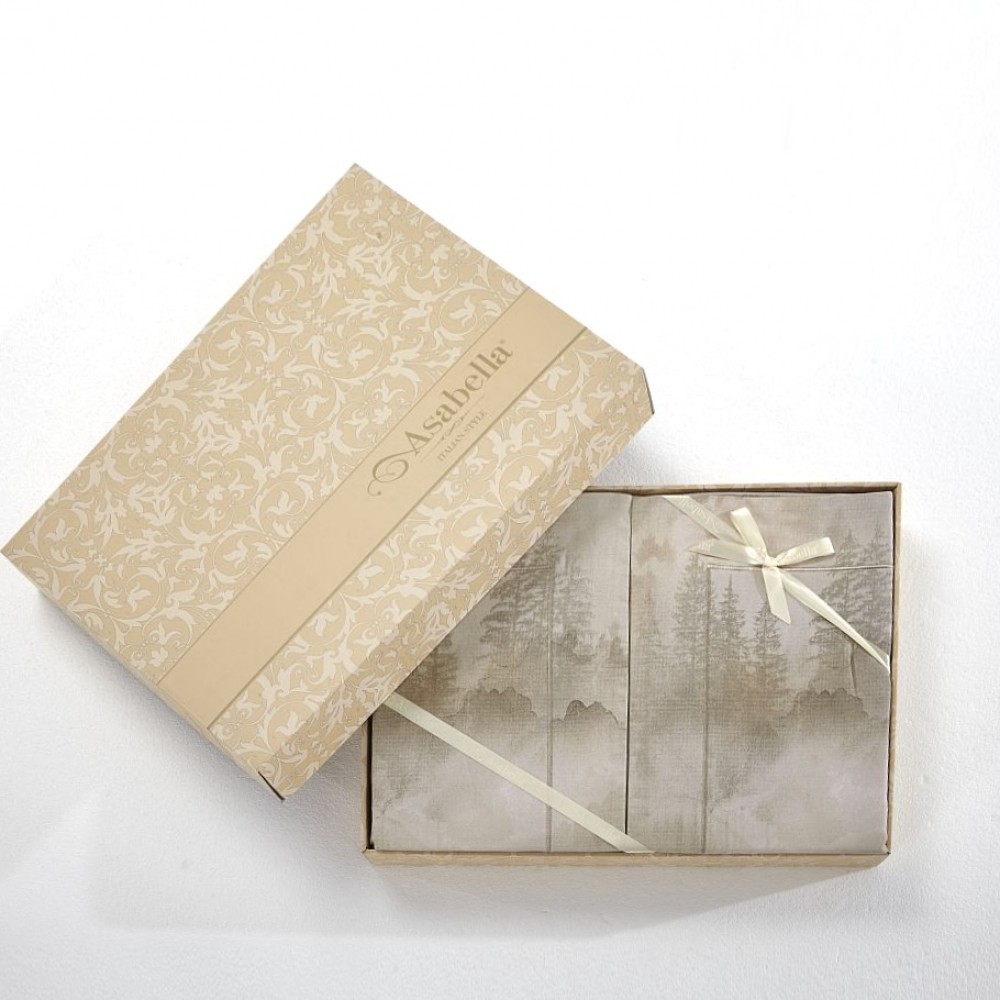 Внешняя сторона пододеяльников и наволочки в размере 50х70 см украшены туманным лесом. Обратная сторона пододеяльников, простыни и наволочки в размере 70х70 см выполнены из ткани-компаньона с меланжевым эффектом.