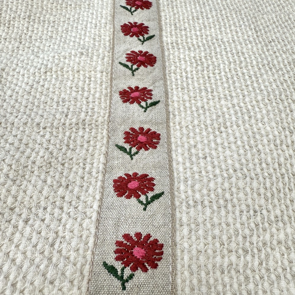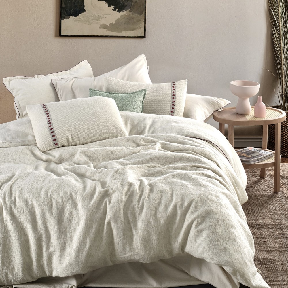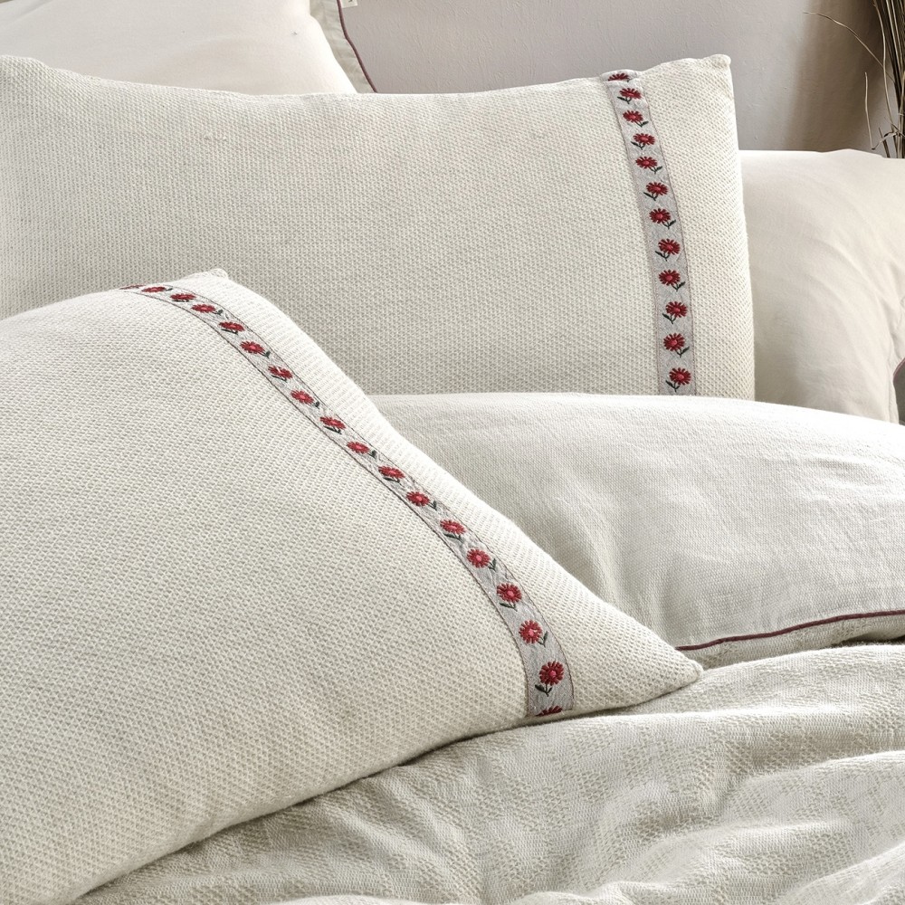 Комплекты постельного белья «Lena» выполнены в стиле Бохо. Красивый натуральный светло-льняной оттенок дополняет льняная тесьма с вышитыми бордовыми цветочками. Особенность этого дизайна - необычная фактура ткани. Ткань невероятно мягкая, воздушная, практически невесомая. Сквозь хлопковое муслиновое полотно проходит льняная нить. Она формирует необычную фактуру. При чем на основных наволочках она идет с одним рисунком, на внешней стороне пододеяльника с другим, а на обратной стороне пододеяльника с третьим. Дополняет дизайн вареный хлопок. Из него выполнены простыни и дополнительные наволочки.