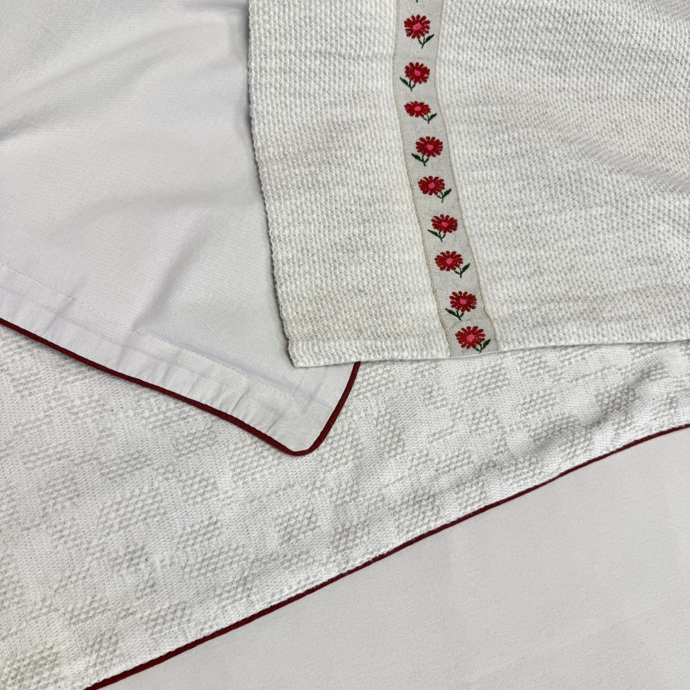 Вход в пододеяльники расположен внизу, закрывается на пуговицы, скрытые в клапане. Все наволочки в комплекте идут в размере 50х70 см. Основные наволочки выполнены в классическом дизайне, декорированы тесьмой с цветочками. Дополнительные идут в оксфордском дизайне, с аккуратными ушками по периметру. Ушки этих наволочек и пододеяльник декорированы тонким бордовым кантом. Наволочки закрываются методом запаха. Простыни в комплектах свободные (прямые). Комплекты упакованы в крафтовые коробки.