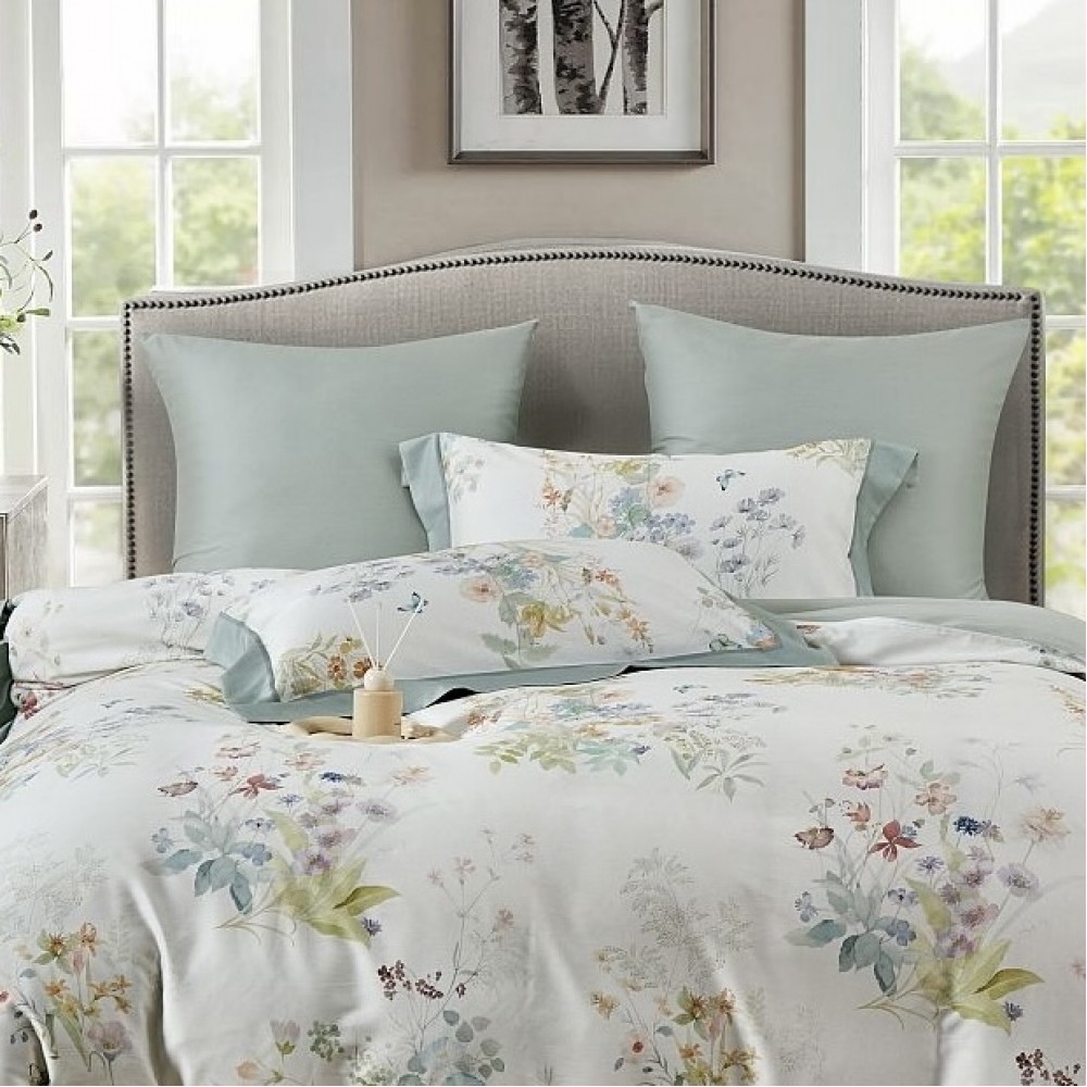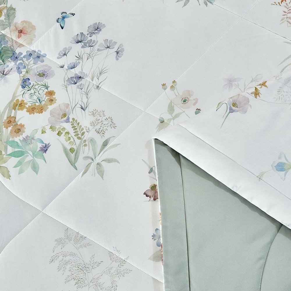 В комплектах вместо традиционных пододеяльников добавлены одеяла-комфортеры. Эти легкие летние одеяла наполнены тенселем и искусственным шелком в равных пропорциях. Воздушные, "дышащие", неприхотливые в уходе. Внешняя сторона одеял и наволочки украшены цветочным принтом. Обратная сторона одеял и простыни выполнены из ткани-компаньона.