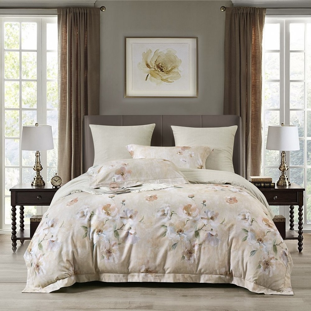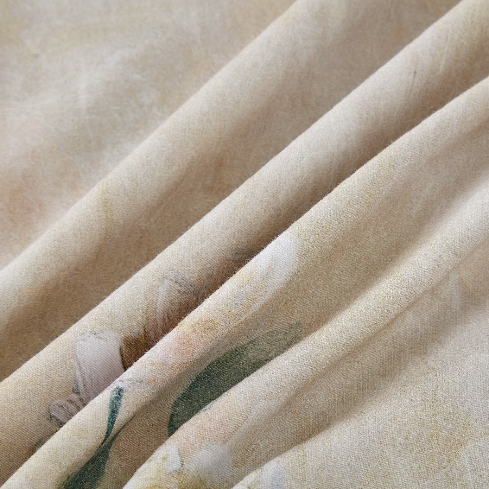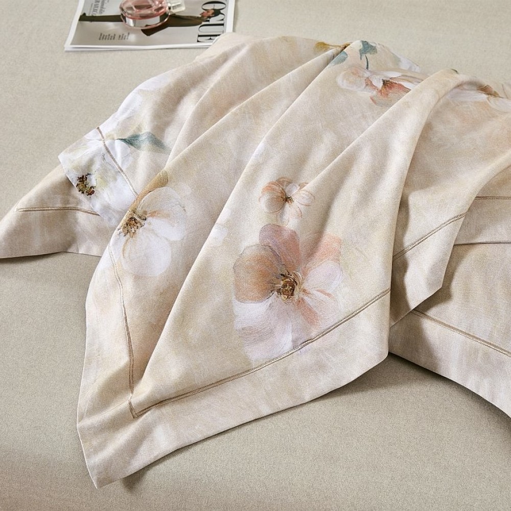 Внешняя сторона пододеяльников и наволочки в размере 50х70 см выполнены из ткани с цветочным принтом. Обратная сторона пододеяльников, простыни и наволочки в размере 70х70 см выполнены из ткани-компаньона с меланжевым эффектом.