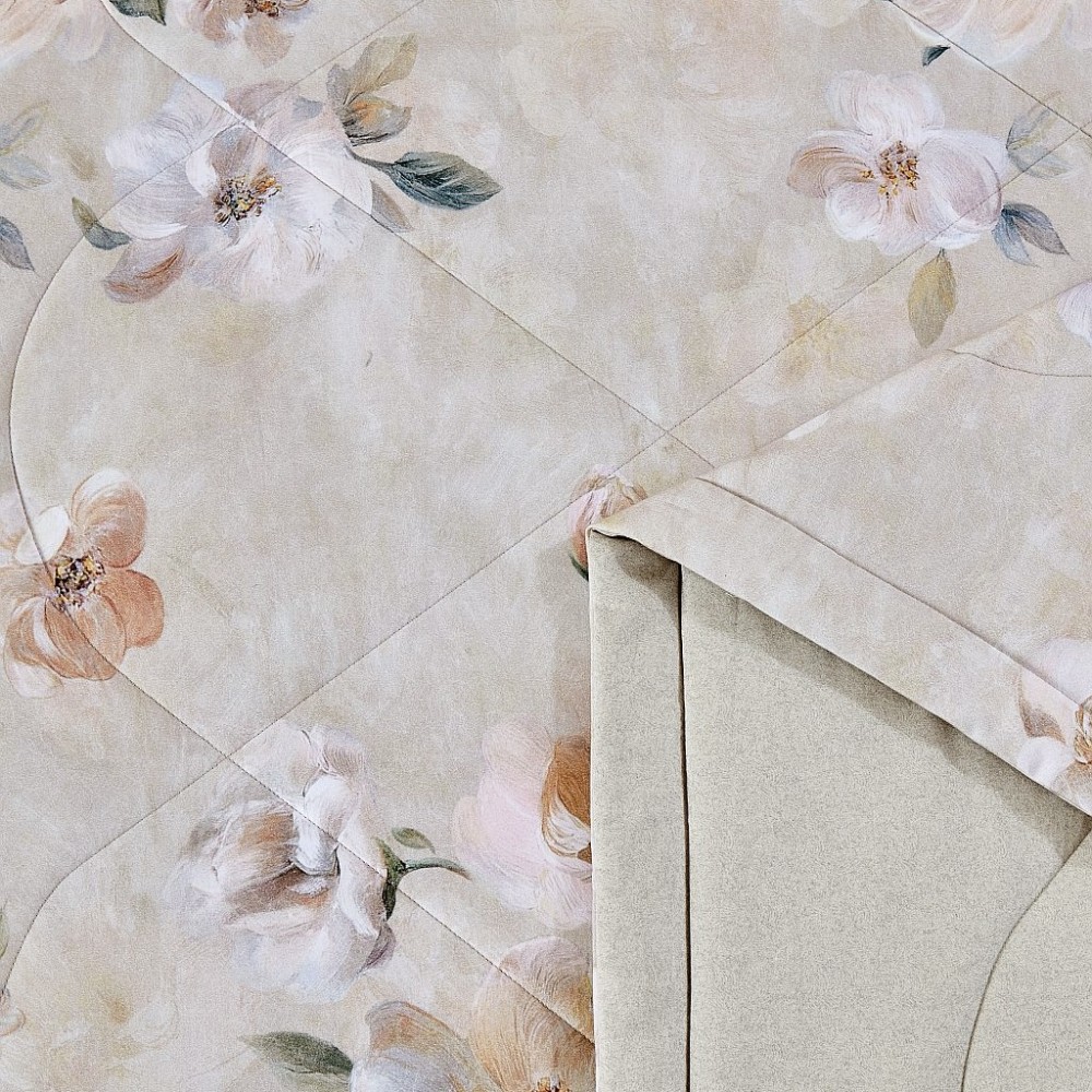 В комплектах вместо традиционных пододеяльников добавлены одеяла-комфортеры. Эти легкие летние одеяла наполнены тенселем и искусственным шелком в равных пропорциях. Воздушные, "дышащие", неприхотливые в уходе. Внешняя сторона одеял и наволочки украшены цветочным принтом. Обратная сторона одеял и простыни выполнены из ткани-компаньона с меланжевым эффектом.