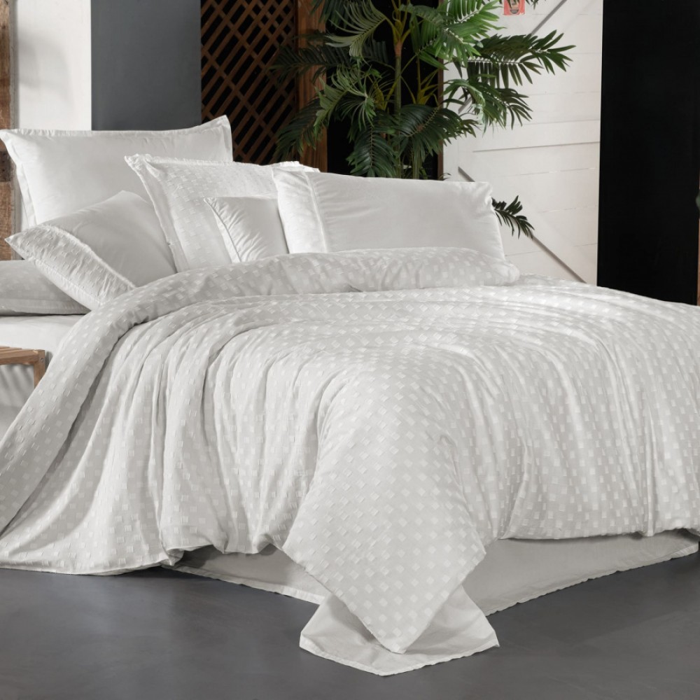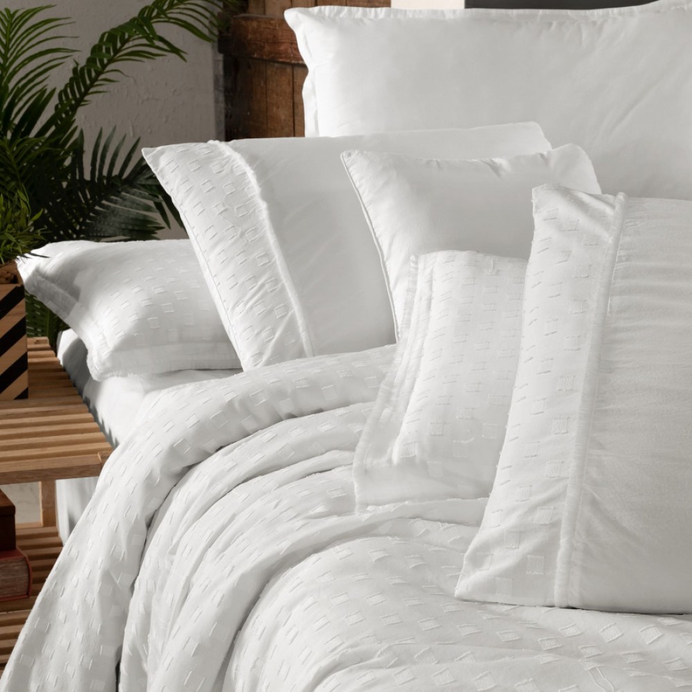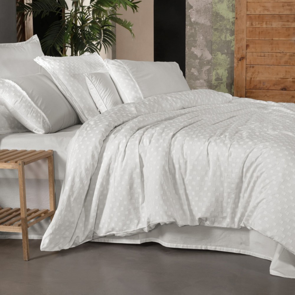 Комплекты постельного белья «Marbella» выполнены в стиле Бохо. В дизайне использованы две ткани. Основная украшена фактурными квадратами. Ткань-компаньон - вареный хлопок. В составе 100% отборный хлопок. Ткани прошли обработку по технологии stonewashed. Так ткани становятся еще мягче, приобретают бархатисто-припудренный эффект и нарочито мятую фактуру.