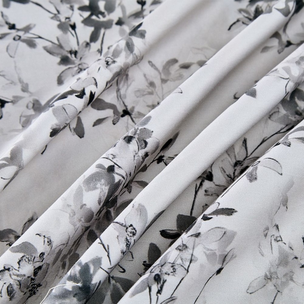 Внешняя сторона пододеяльников и наволочки в размере 50х70 см украшены цветочными принтом. Обратная сторона пододеяльников, простыни и наволочки в размере 70х70 см выполнены из однотонной ткани-компаньона.