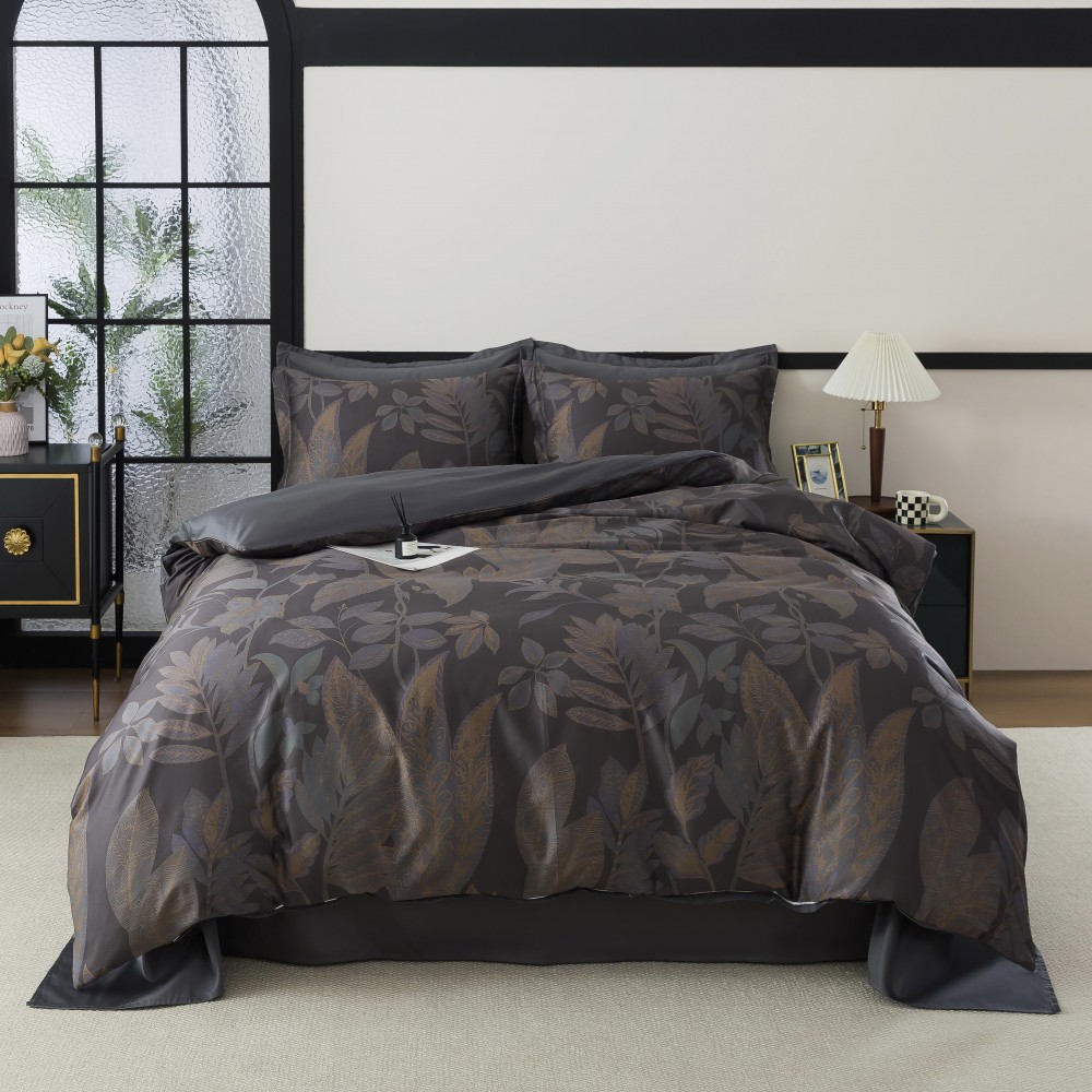 В дизайне «Noire» скомбинированы две ткани. Основная ткань (верх пододеяльников и наволочек) украшена крупными листьями. Ткань-компаньон (обратная сторона пододеяльников, наволочек и простыни): полностью однотонная.