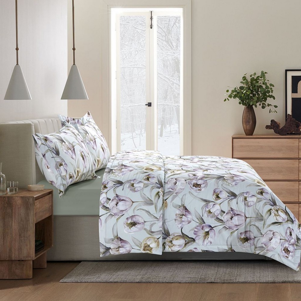 В комплекте вместо традиционных пододеяльников добавлены одеяла-комфортеры. Эти легкие одеяла наполнены тенселем и искусственным шелком в равных пропорциях. Воздушные, "дышащие", неприхотливые в уходе. Внешняя сторона одеял и наволочки украшены тюльпанами. Обратная сторона одеял и простыни выполнены из однотонной ткани-компаньона.
