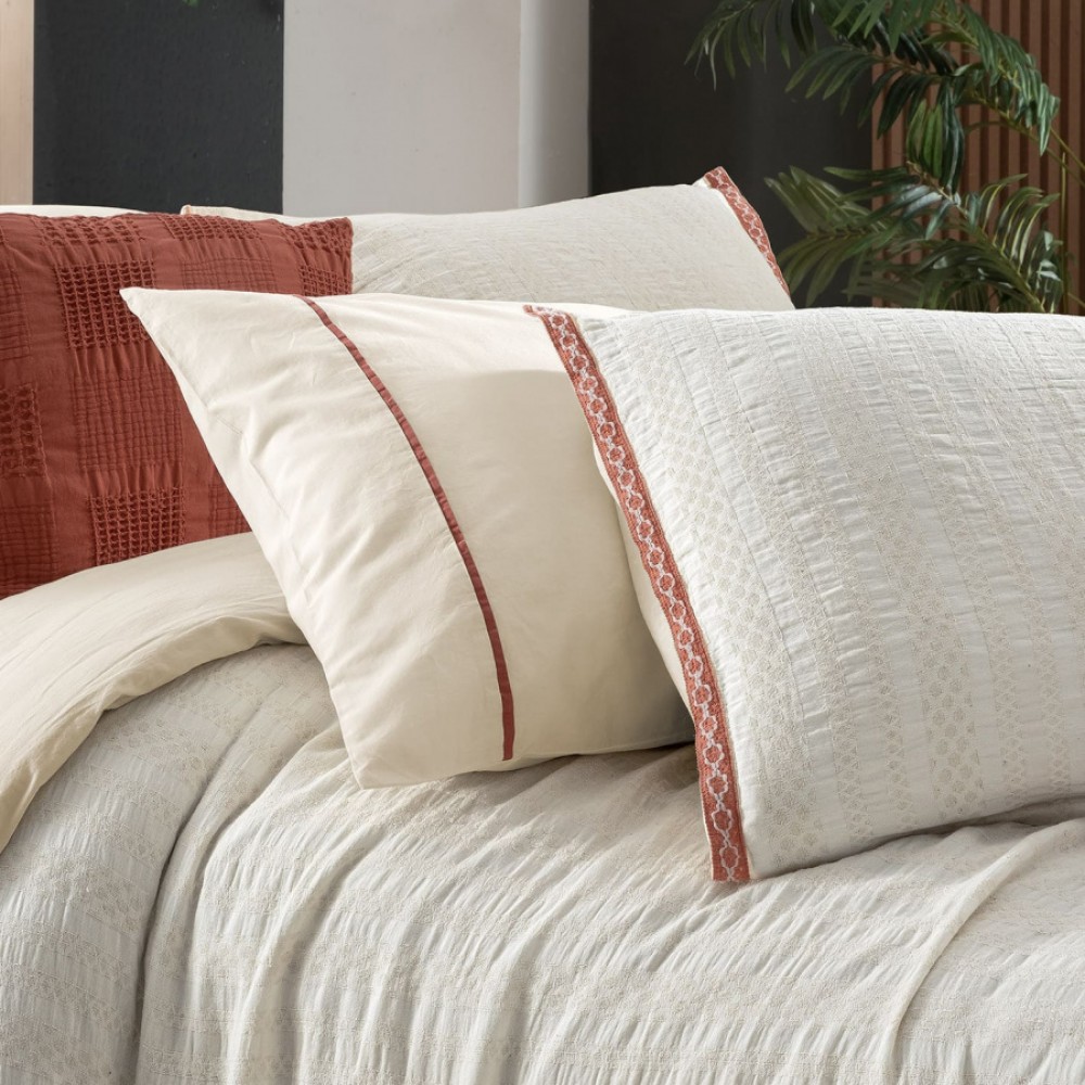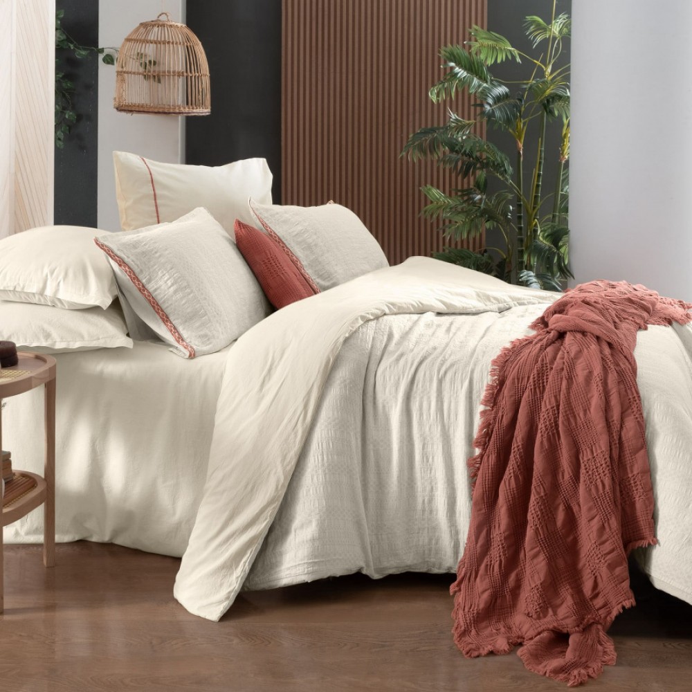 Комплекты постельного белья «Palencia» выполнены в стиле Бохо. Красивый натуральный оттенок небеленого хлопка дополняет терракотовая отделка. В натуральных оттенках жатые воздушные фактуры выглядят особенно выгодно. В дизайне использованы две ткани. Основная сделана из жатого хлопка с текстурированными вставками. Ткань-компаньон - вареный хлопок. В составе 100% отборный хлопок. Ткани прошли обработку по технологии stonewashed. Так ткани становятся еще мягче, приобретают бархатисто-припудренный эффект и нарочито мятую фактуру.