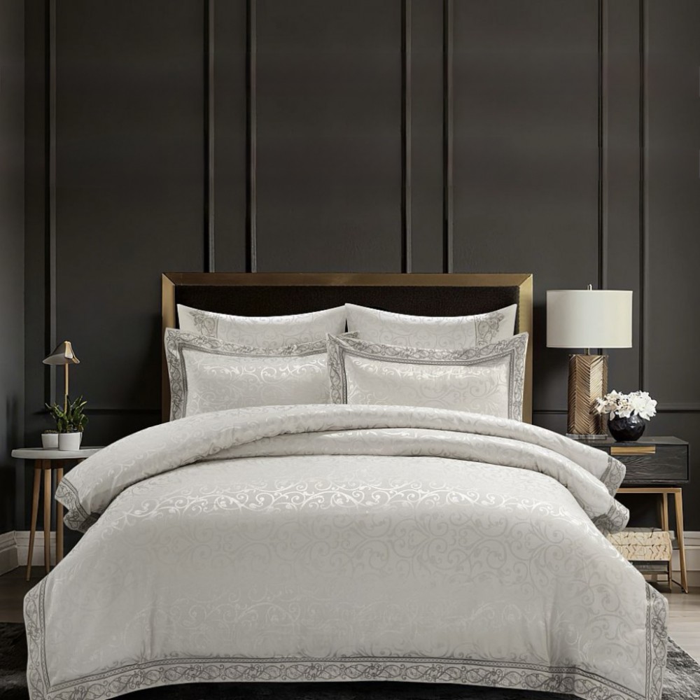Комплект постельного белья «Perla Grigia» из жаккарда с вышивкой; состав: жаккардовый сатин - 45% хлопок, 55% вискоза, сатин - 100% хлопок; размер евро.
