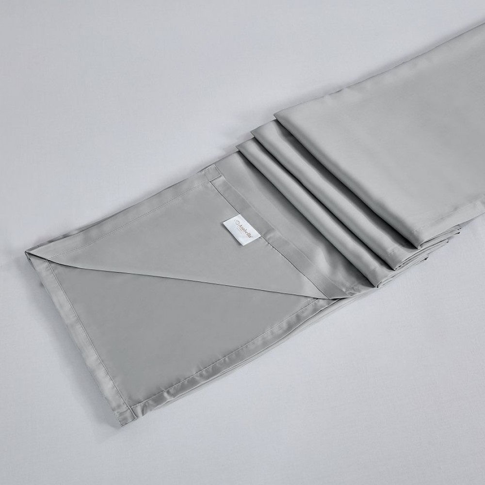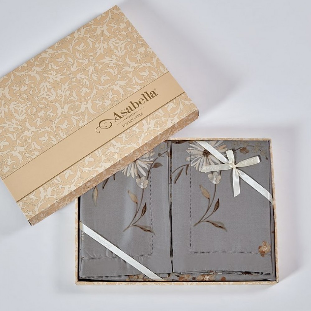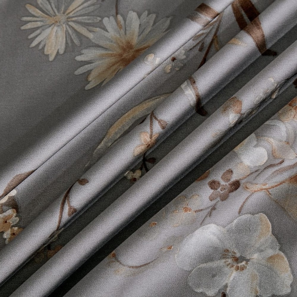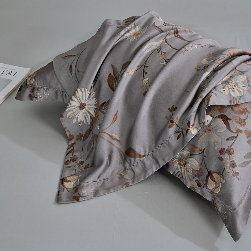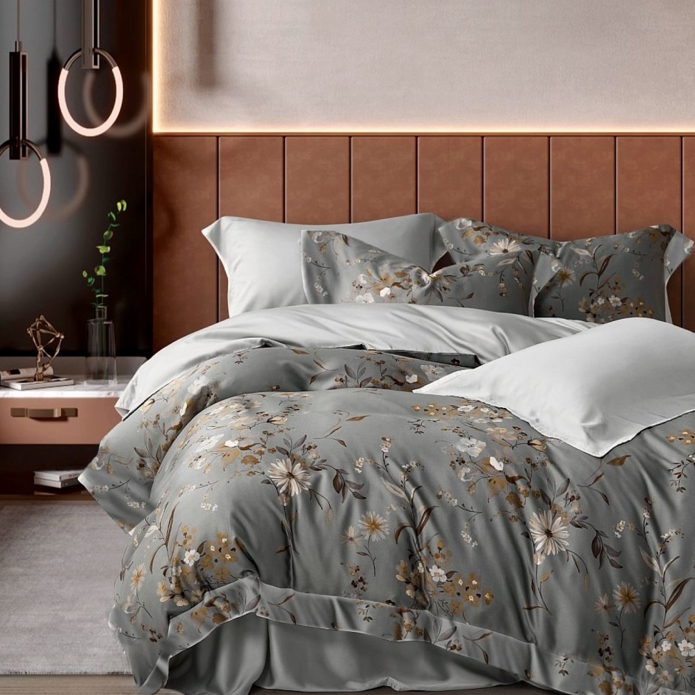 Постельное белье «Regina» выдержано в серых тонах. Внешняя сторона пододеяльников и наволочки в размере 50х70 см украшены цветочным рисунком. Обратная сторона пододеяльников, простыни и наволочки в размере 70х70 см выполнены из однотонной ткани-компаньона в сером оттенке.
