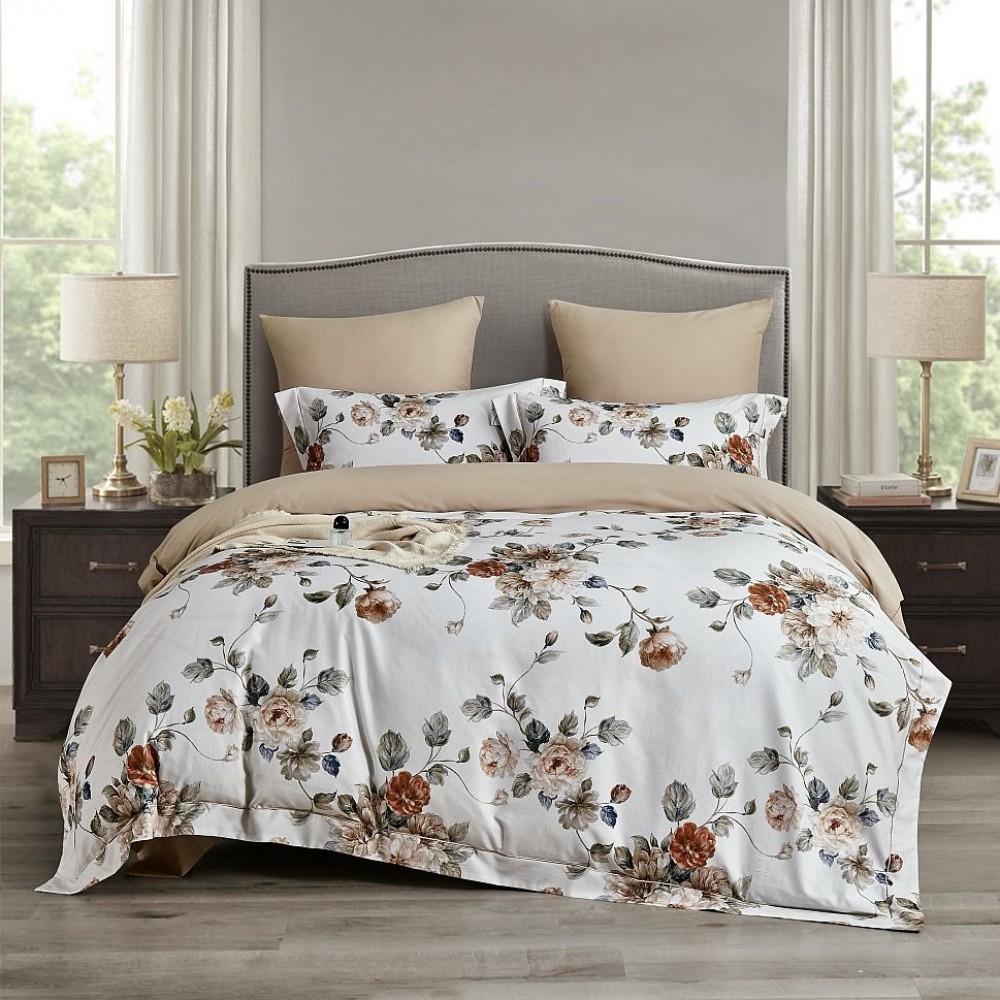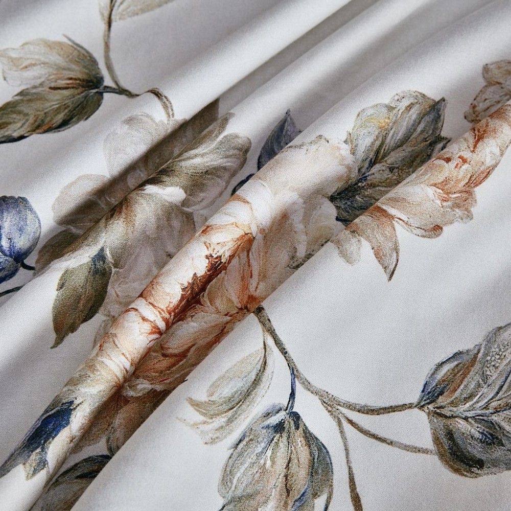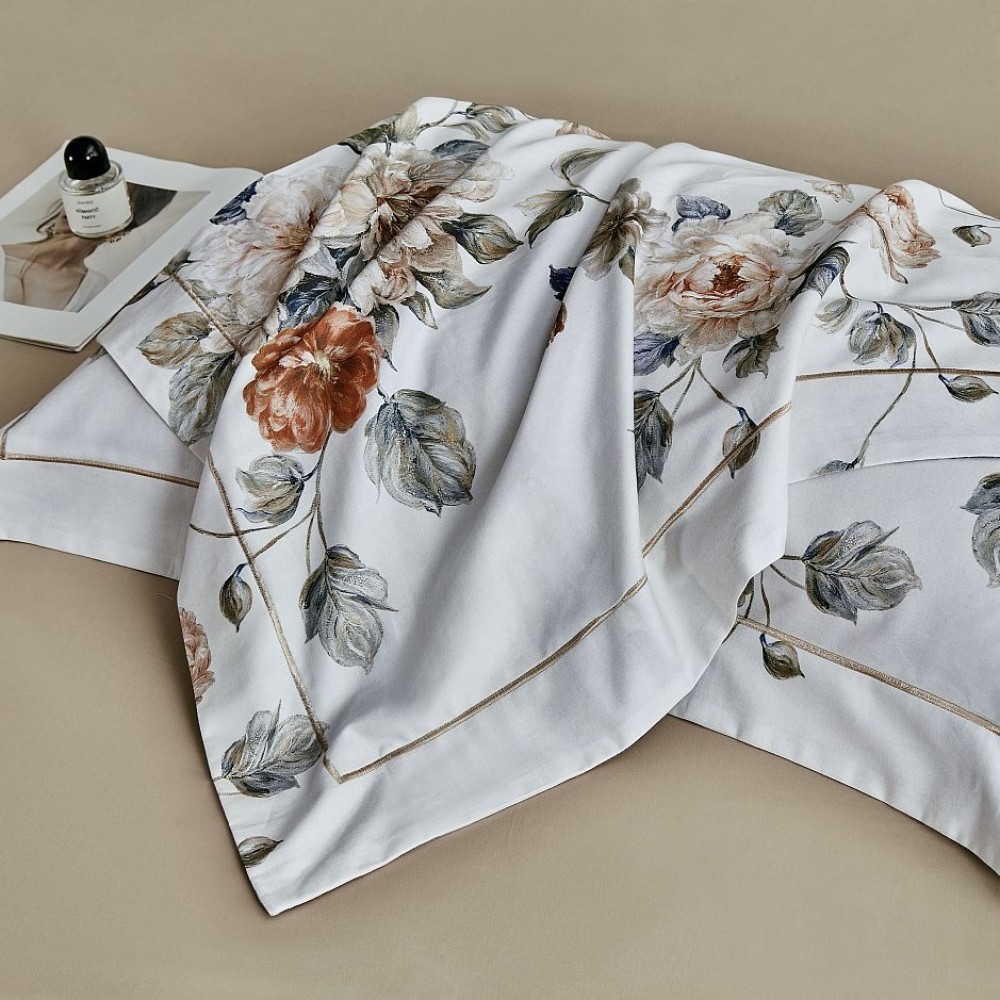 Внешняя сторона пододеяльников и наволочки в размере 50х70 см украшены крупными цветами. Обратная сторона пододеяльников, простыни и наволочки в размере 70х70 см выполнены из ткани-компаньона.