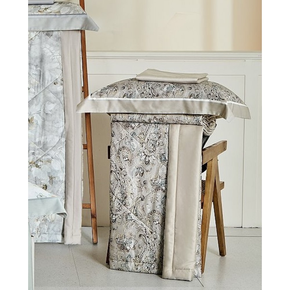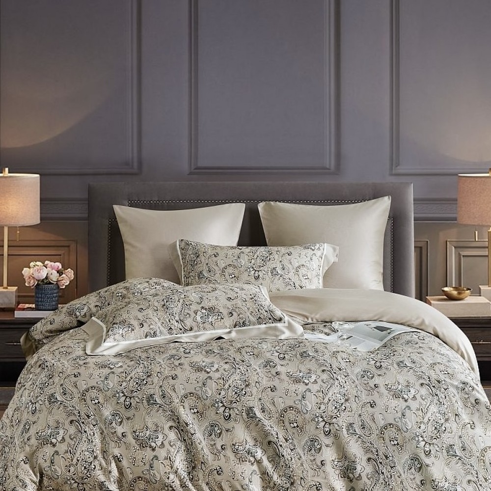 В комплектах вместо традиционных пододеяльников добавлены одеяла-комфортеры. Эти легкие летние одеяла наполнены тенселем и искусственным шелком в равных пропорциях. Воздушные, "дышащие", неприхотливые в уходе. Внешняя сторона одеял и наволочки украшены принтом с индийскими огруцами. Обратная сторона одеял и простыни выполнены из ткани-компаньона.