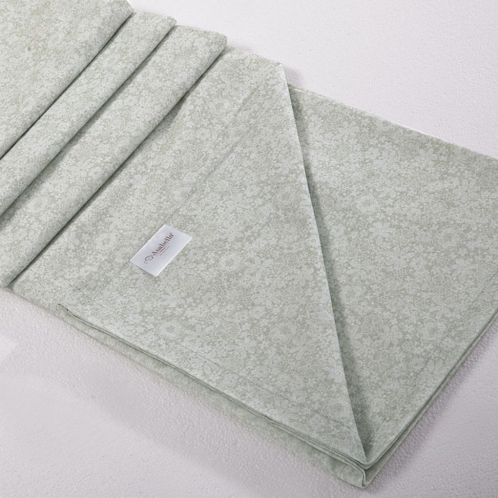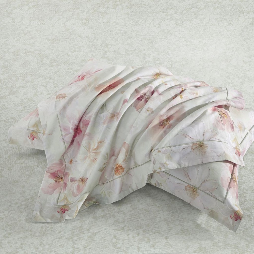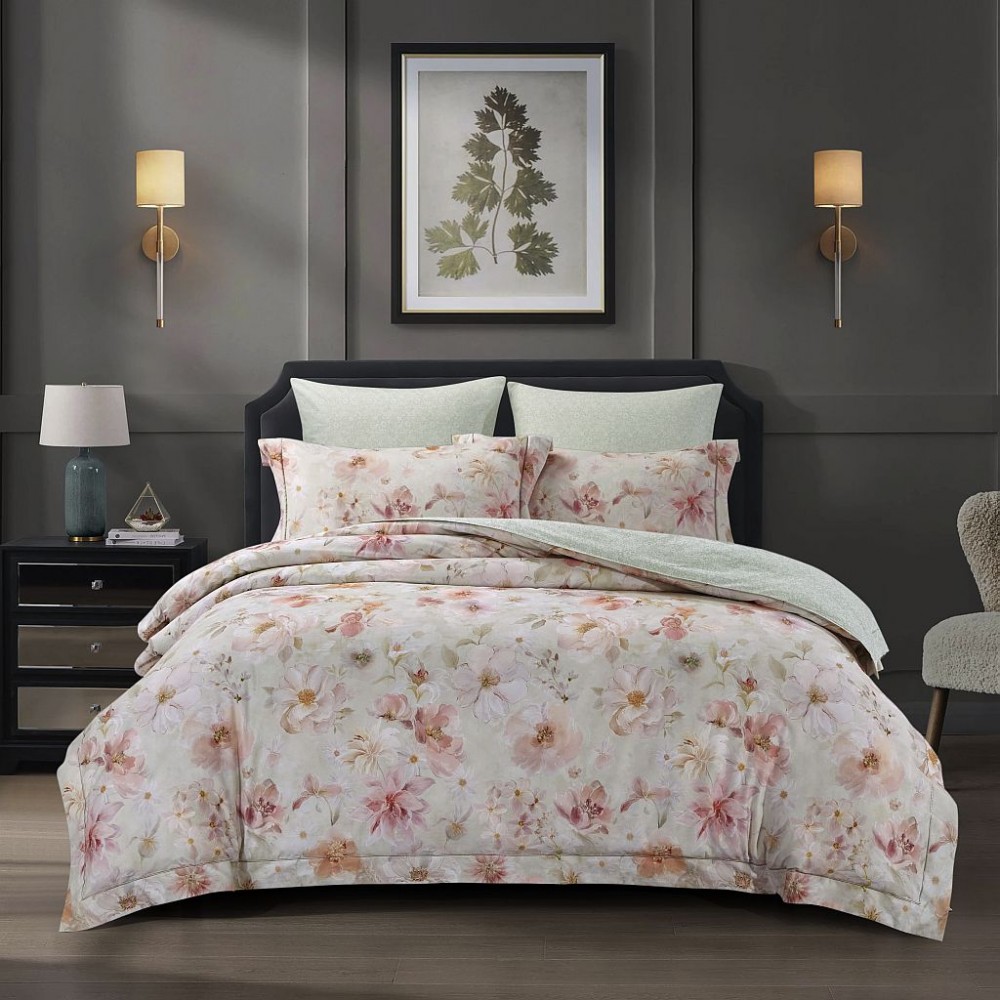 Внешняя сторона пододеяльников и наволочки в размере 50х70 см украшены крупными цветами. Обратная сторона пододеяльников, простыни и наволочки в размере 70х70 см выполнены из ткани-компаньона с цветочным узором.