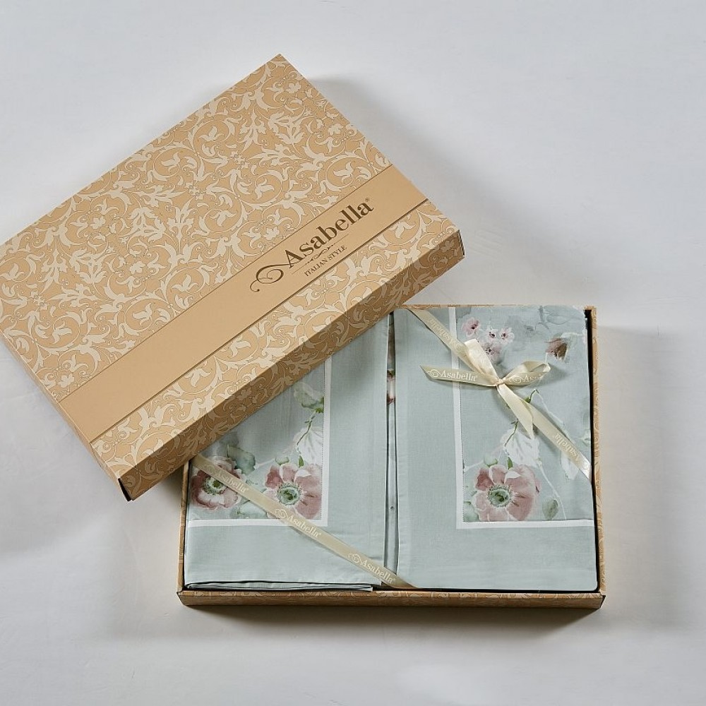 Пододеяльники декорированы "ушками" с трех сторон. Закрываются на скрытую молнию, расположенную внизу пододеяльника. Внутри пододеяльников предусмотрены специальные тесемочки для фиксации одеяла (на одеяле должны быть ответные петли). Эта небольшая деталь сделает использование постельного белья еще комфортнее: одеяло не сбивается в пододеяльнике, и заправлять его становится гораздо удобнее. Наволочки в размере 50х70 см выполнены в оксфордском дизайне - с "ушками" по периметру с трех сторон. Наволочки в размере 70х70 см выполнены в классическом дизайне. Все наволочки закрываются методом запаха. Простыня в комплекте свободная (прямая). Комплекты упакованы в подарочную коробку.