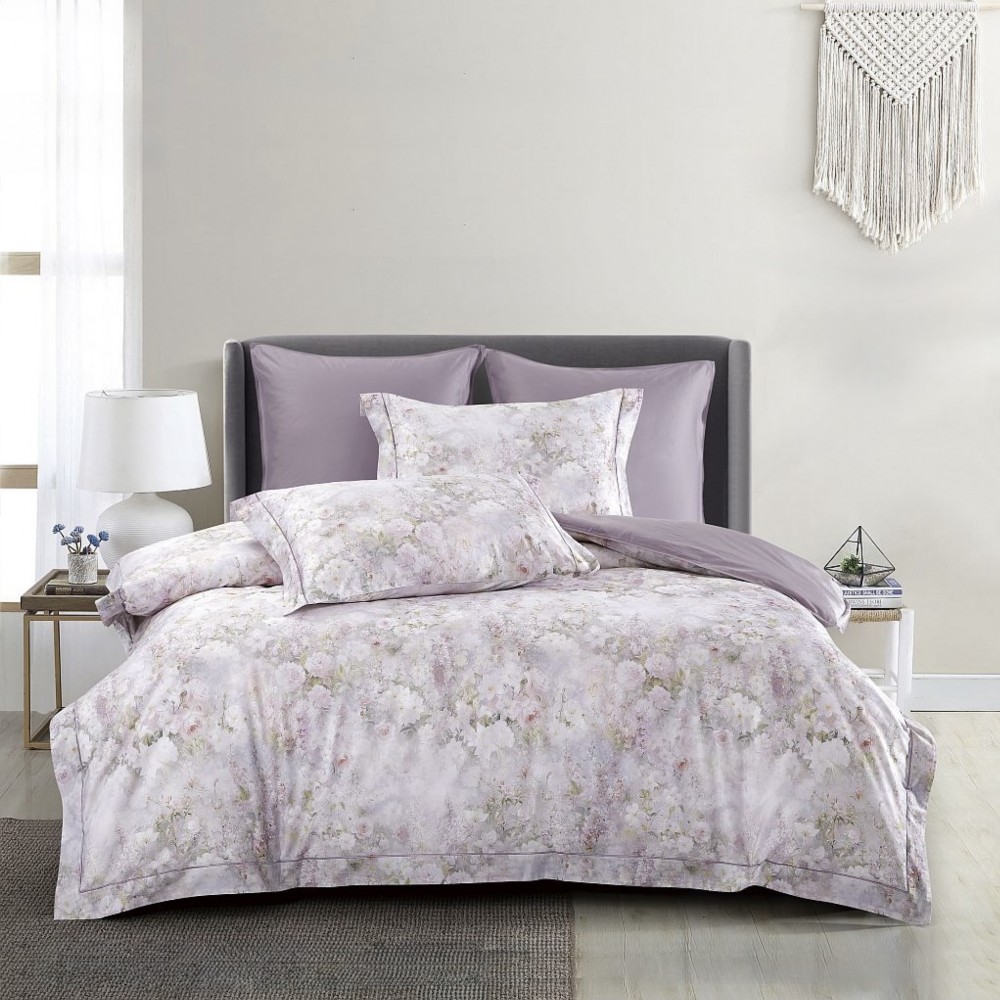Внешняя сторона пододеяльников и наволочки в размере 50х70 см украшены цветочным принтом. Обратная сторона пододеяльников, простыни и наволочки в размере 70х70 см выполнены из однотонной ткани-компаньона.