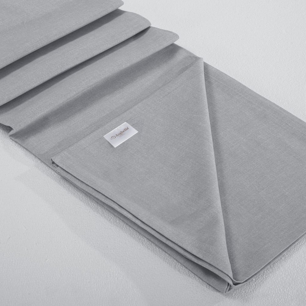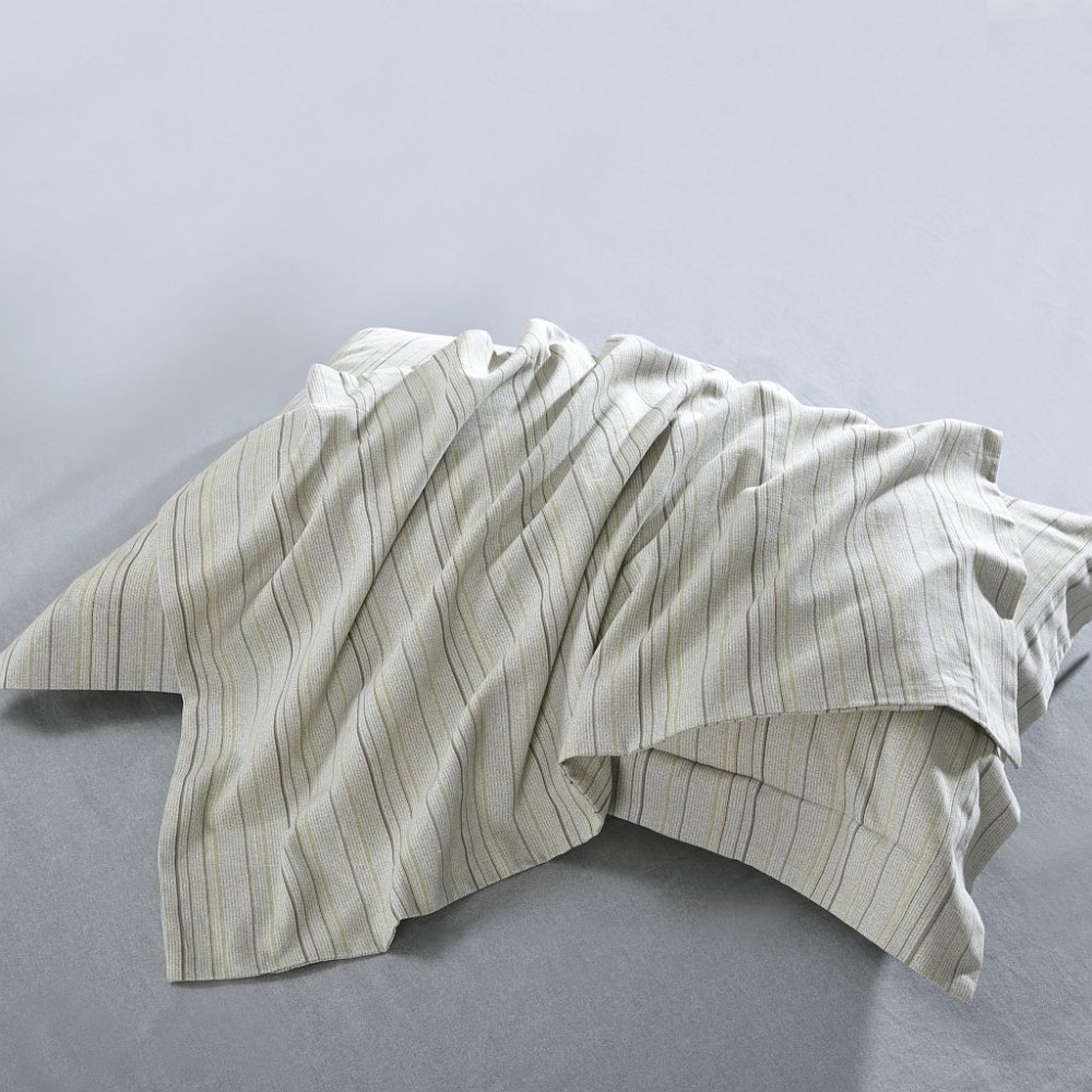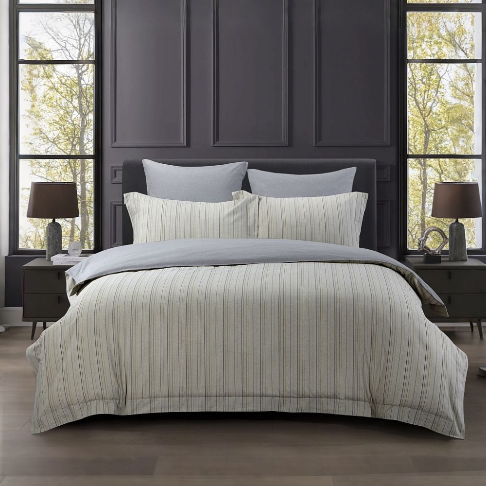 Внешняя сторона пододеяльников и наволочки в размере 50х70 см выполнены из ткани в полоску. Обратная сторона пододеяльников, простыни и наволочки в размере 70х70 см выполнены из ткани-компаньона с меланжевым эффектом.
