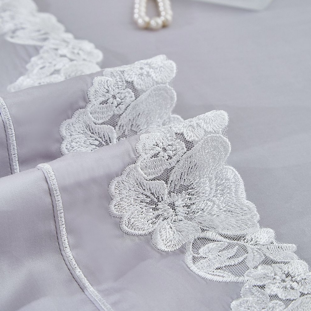 Кружевом украшены "ушки" пододеяльника и основные наволочки. Все наволочки в комплекте идут в классическом дизайне. Дополнительные наволочки (в размере 70х70 см) имеют двойную отстрочку по периметру и изящный кружевной цветочек в уголке. Наволочки закрываются методом запаха. Вход в пододеяльники расположен внизу на скрытой молнии. Внутри пододеяльников предусмотрены специальные тесемочки для фиксации одеяла (на одеяле должны быть ответные петли). Эта небольшая деталь сделает использование постельного белья еще комфортнее: одеяло не сбивается в пододеяльнике, и заправлять его становится гораздо удобнее. Простыни в комплектах свободные (прямые). Упакованы комплекты в подарочные коробки.