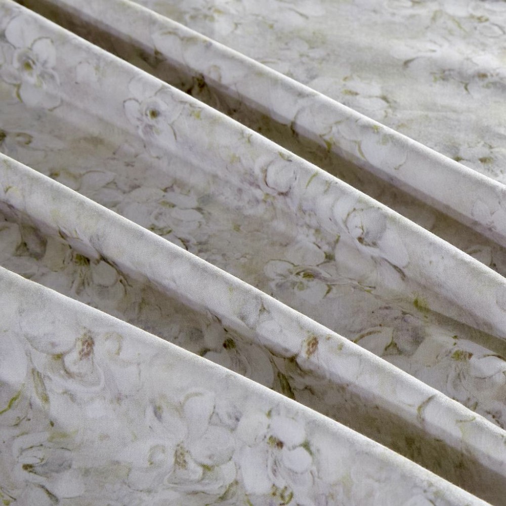 Внешняя сторона пододеяльников и наволочки в размере 50х70 см украшены принтом с яблоневыми цветами. Обратная сторона пододеяльников, простыни и наволочки в размере 70х70 см выполнены из однотонной ткани-компаньона в пыльно-оливковом оттенке.