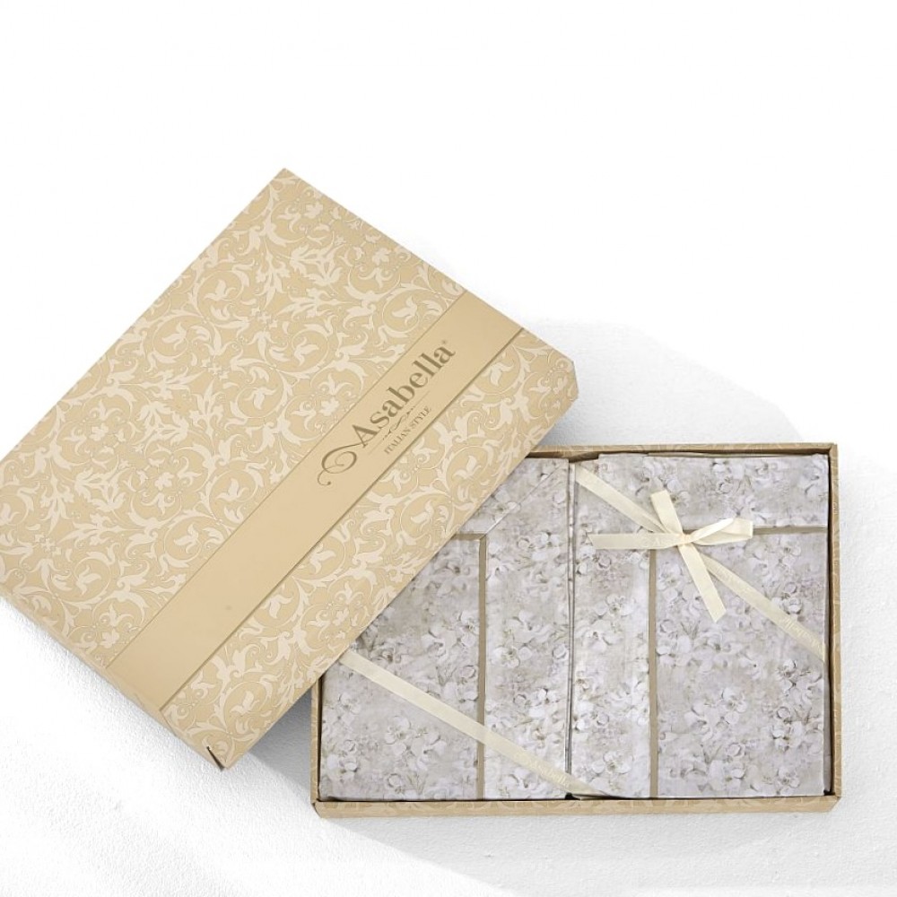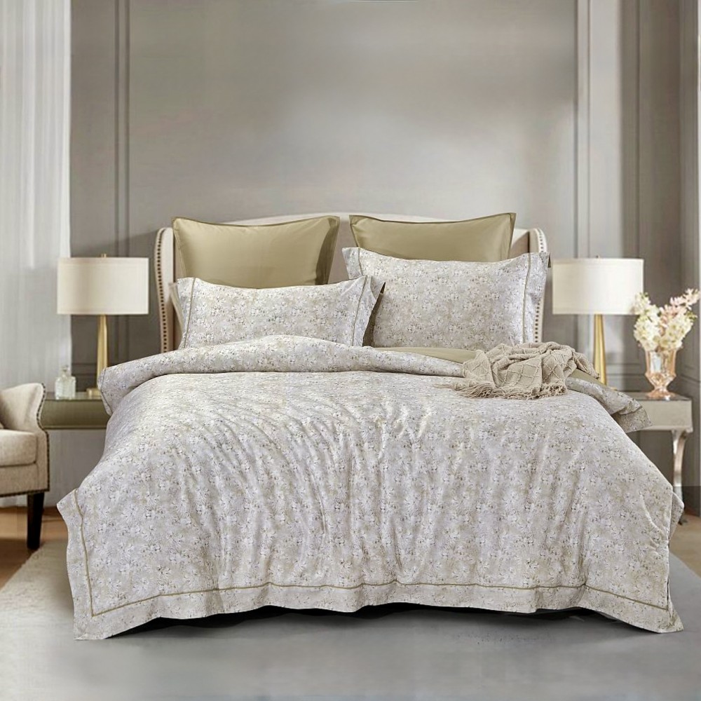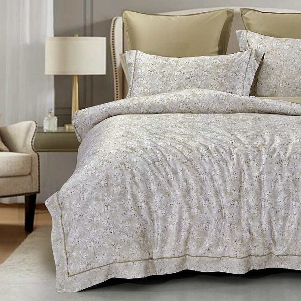 Комплекты постельного белья «Яблоневый цвет» выполнены из нежнейшего струящегося сатина в серо-бежевой гамме с оливковыми акцентами. В составе 61% тенселя и 39% хлопка. Благодаря такому сочетанию ткань приобретает особую нежность, дополнительное сияние и неповторимую изящность.