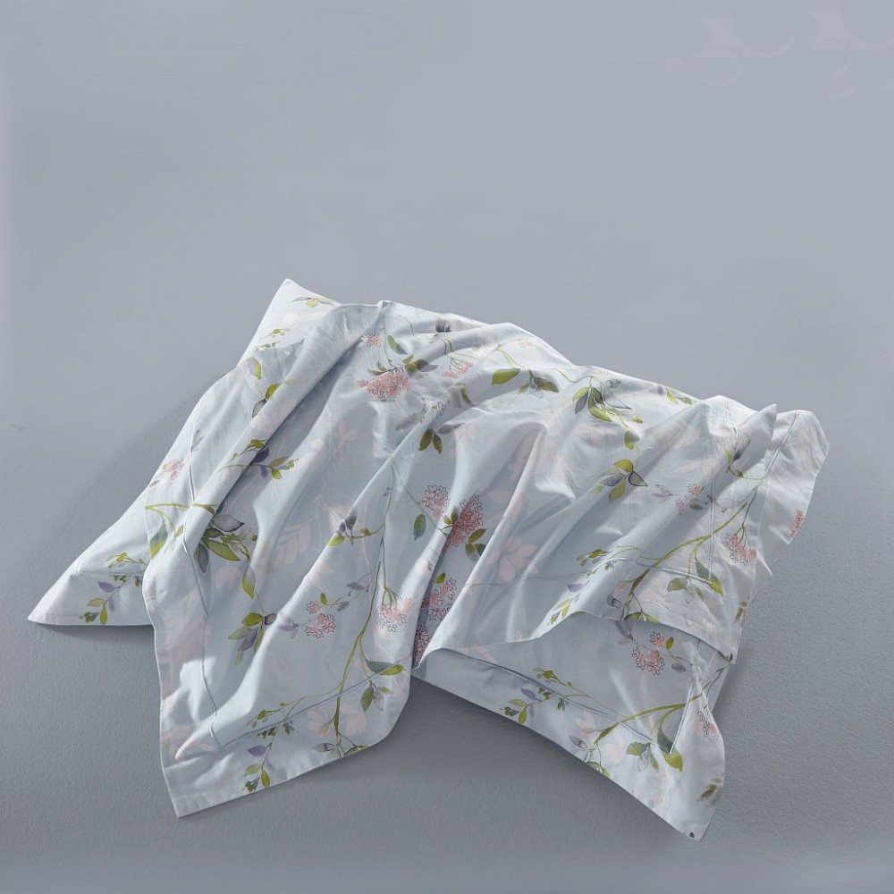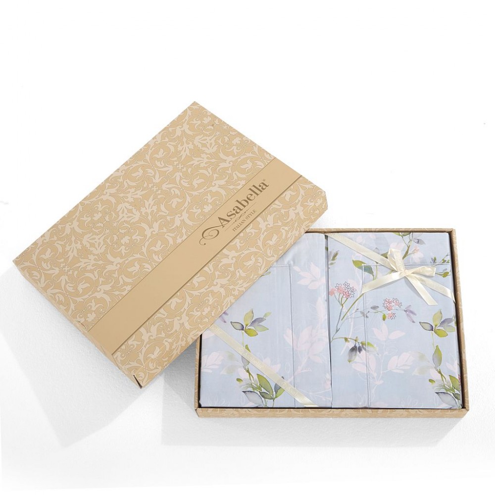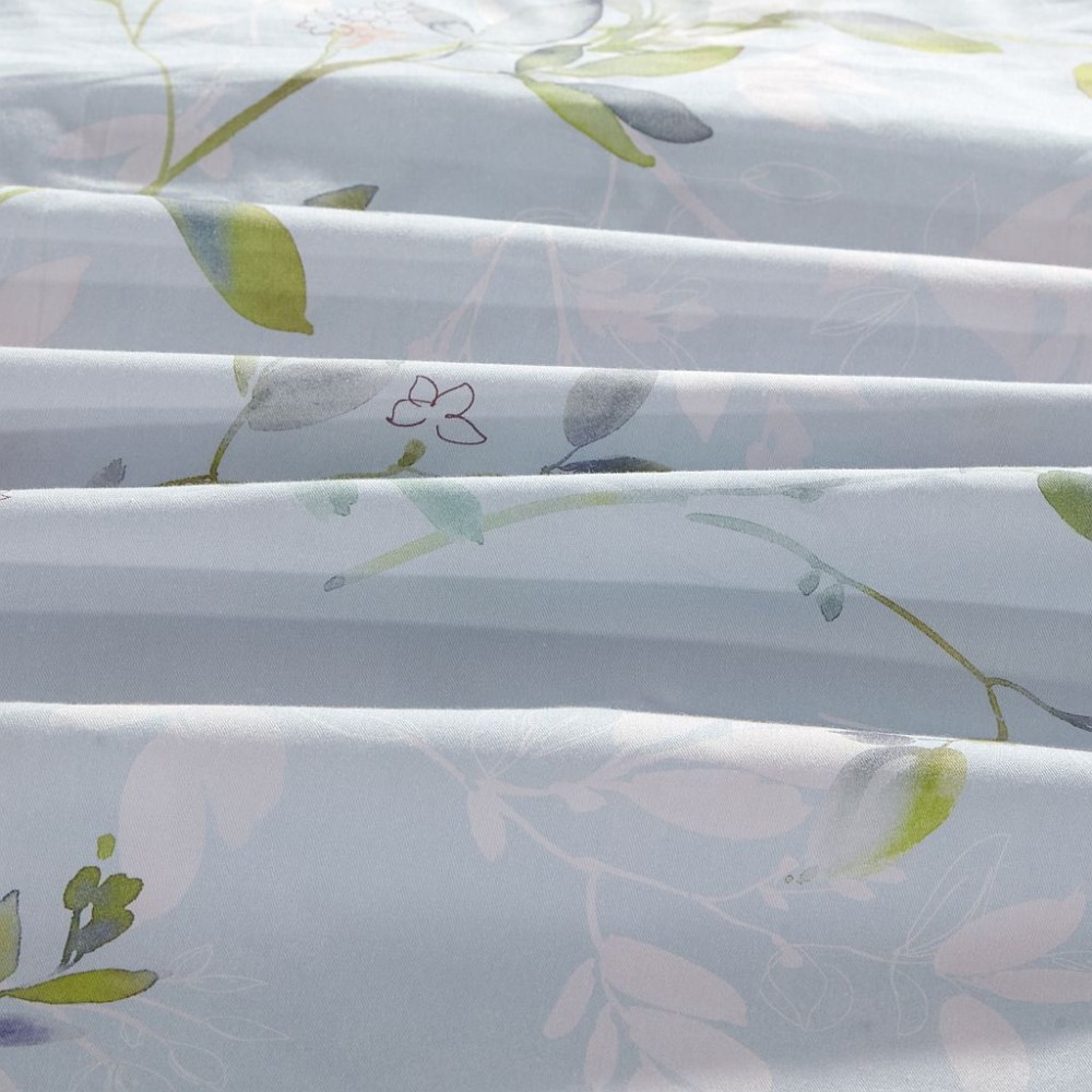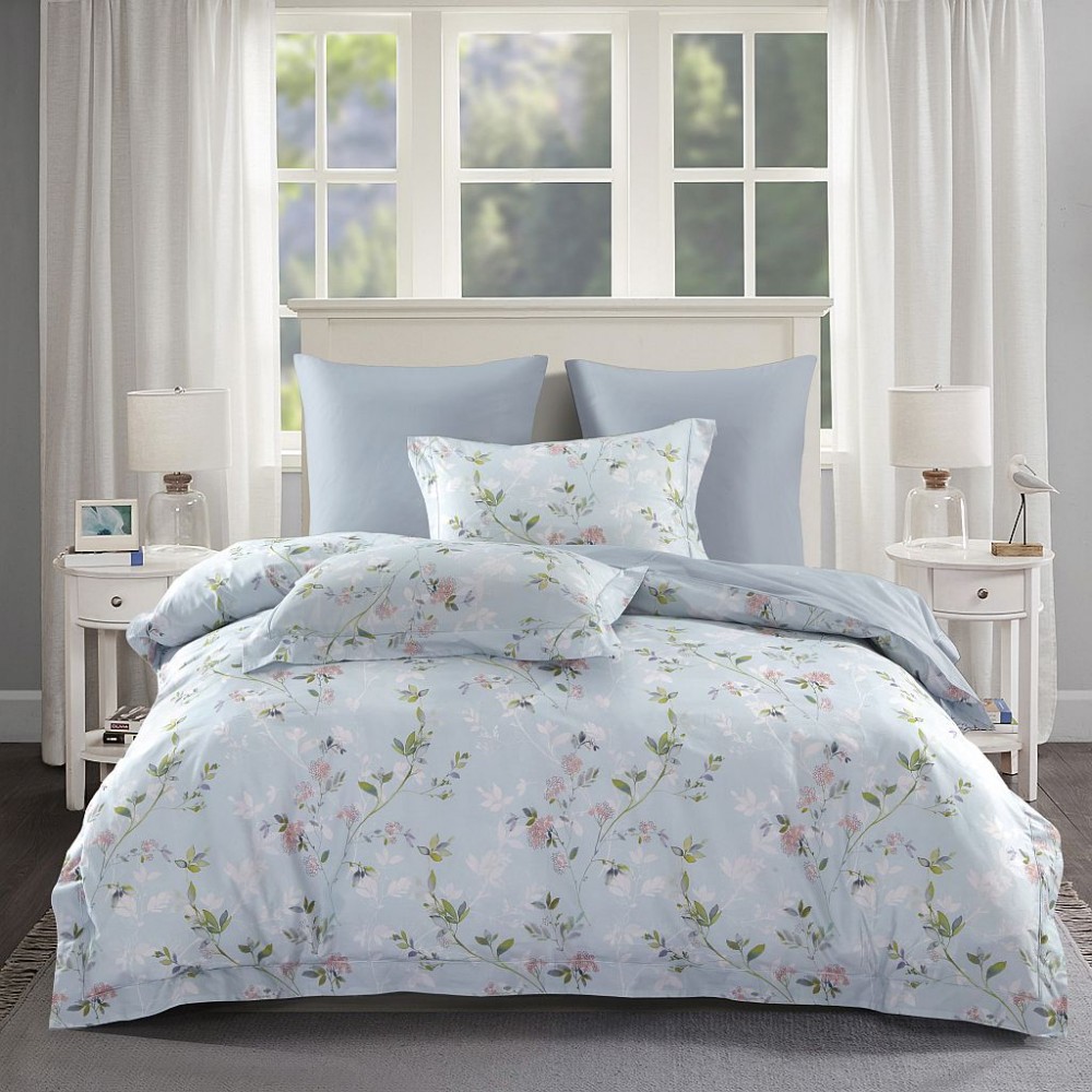 Внешняя сторона пододеяльников и наволочки в размере 50х70 см украшены цветущими веточками. Обратная сторона пододеяльников, простыни и наволочки в размере 70х70 см выполнены из однотонной ткани-компаньона.
