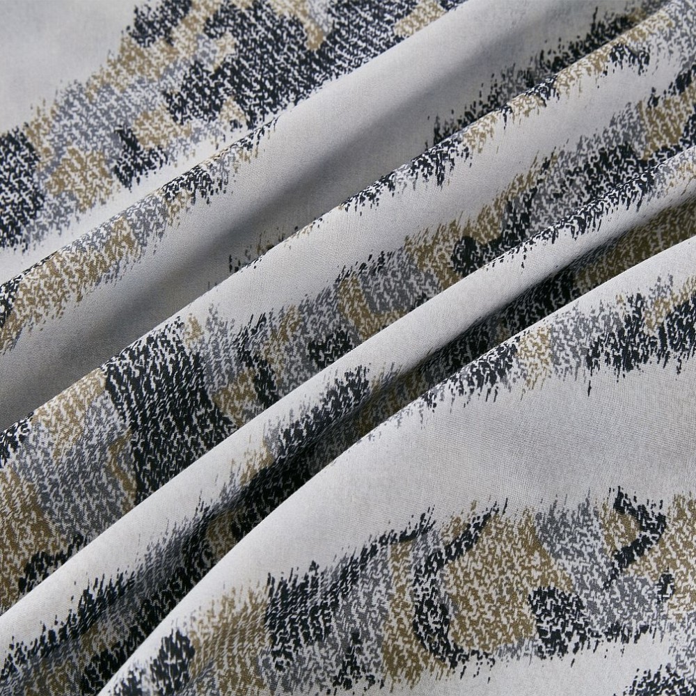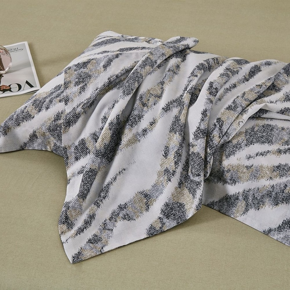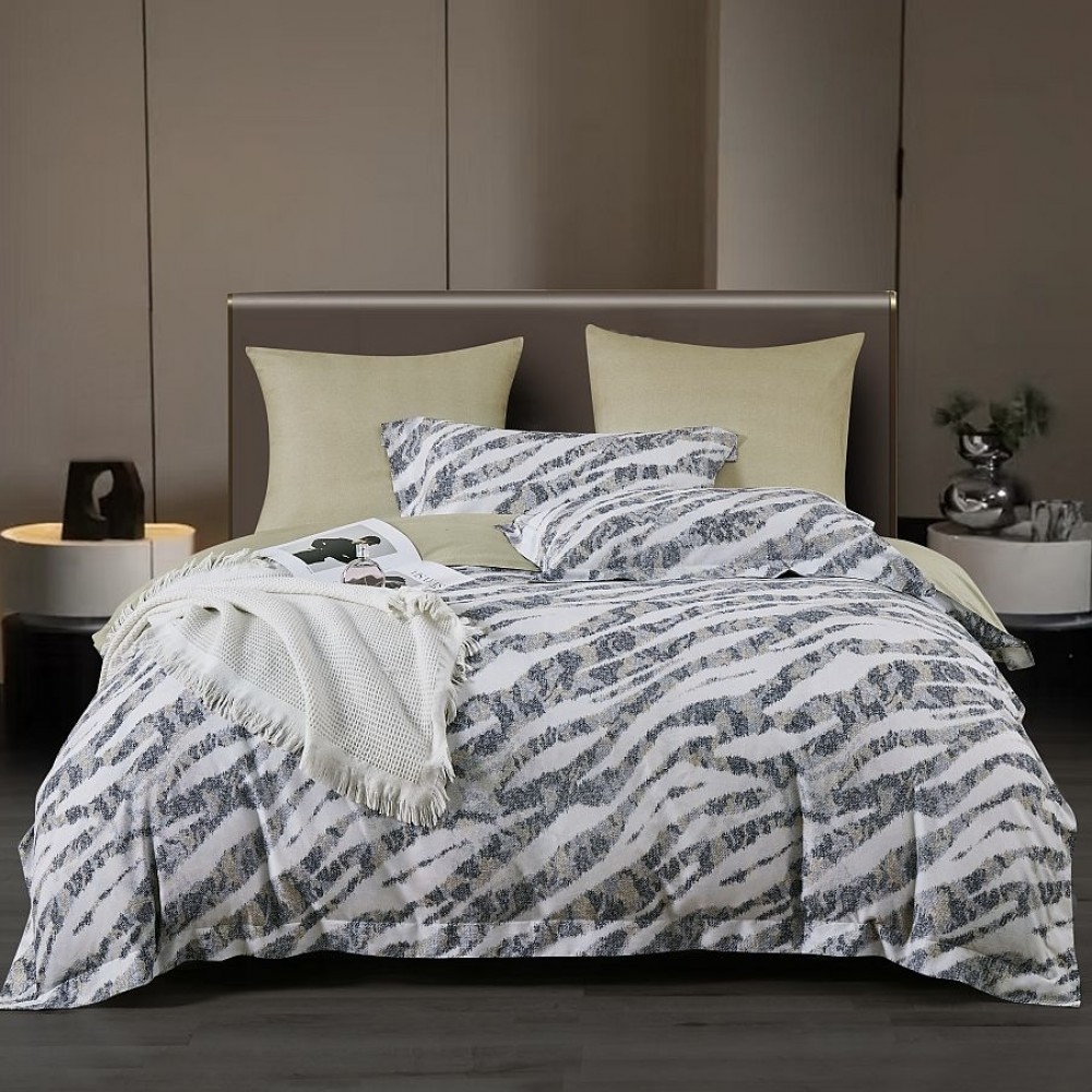 Внешняя сторона пододеяльников и наволочки в размере 50х70 см украшены принтом по мотивам полосок зебры. Обратная сторона пододеяльников, простыни и наволочки в размере 70х70 см выполнены из ткани-компаньона.