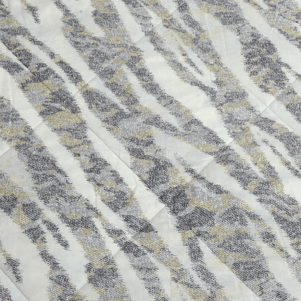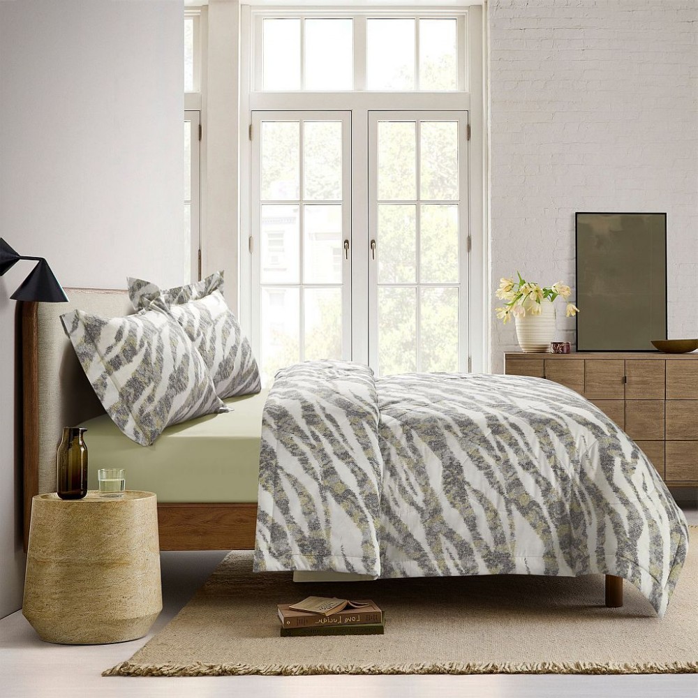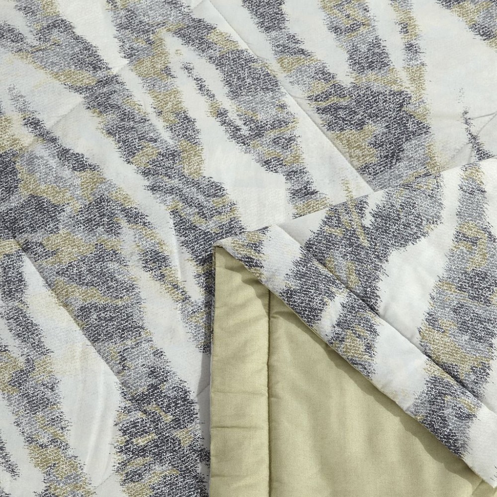 В комплектах вместо традиционных пододеяльников добавлены одеяла-комфортеры. Эти легкие летние одеяла наполнены тенселем и искусственным шелком в равных пропорциях. Воздушные, "дышащие", неприхотливые в уходе. Внешняя сторона одеял и наволочки украшены принтом по мотивам полосок зебры. Обратная сторона одеял и простыни выполнены из ткани-компаньона с меланжевым эффектом в пастельно-оливковом оттенке.