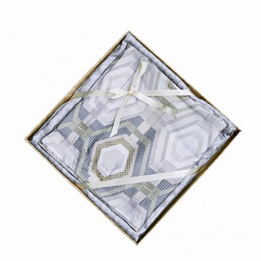 Наволочки выполнены в оксфордском дизайне - по периметру декорированы "ушками". По отстрочке "ушка" проходит тонкая прошва мережки. Закрываются методом запаха. Наволочки украшены шестиугольным орнаментом. Простыни в комплектах свободные (прямые). Выполнены из ткани-компаньона с мелким принтом. Комплекты упакованы в подарочные коробки.